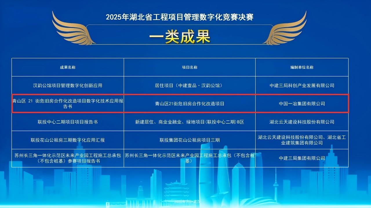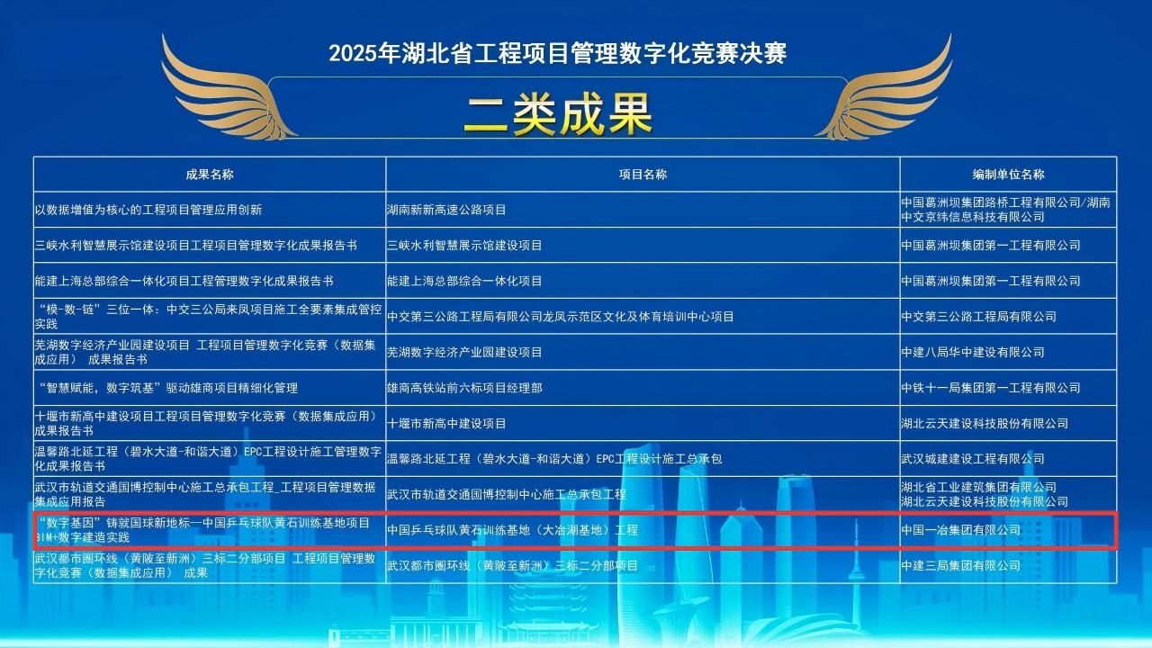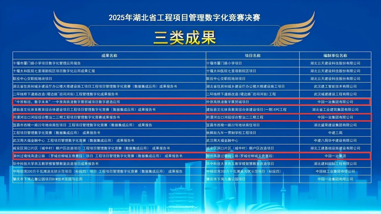 9月10日,2025年湖北省工程項目管理數(shù)字化競賽決賽落下帷幕。中國一冶選送的成果獲一類成果1項,二類成果1項,三類成果3項。